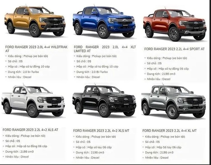 Theo thông tin mới nhất từ một số đại lý của Ford Việt Nam, khả năng cao Ford Ranger 2023 thế hệ mới về Việt Nam cũng sẽ có đủ 3 phiên bản Wildtrak, Sport và XLT Limited như các thị trường lớn của Ford như Nam Phi và Thái Lan. Đi kèm với đó là hai phiên bản XLS (4x2 và 4x4) cùng một phiên bản XL 4x4 MT.